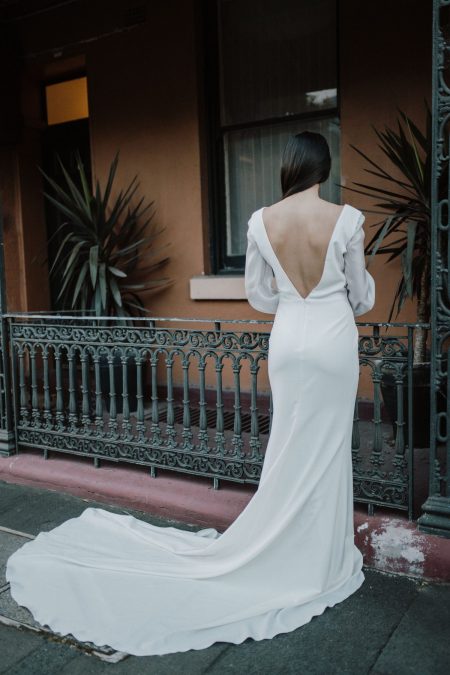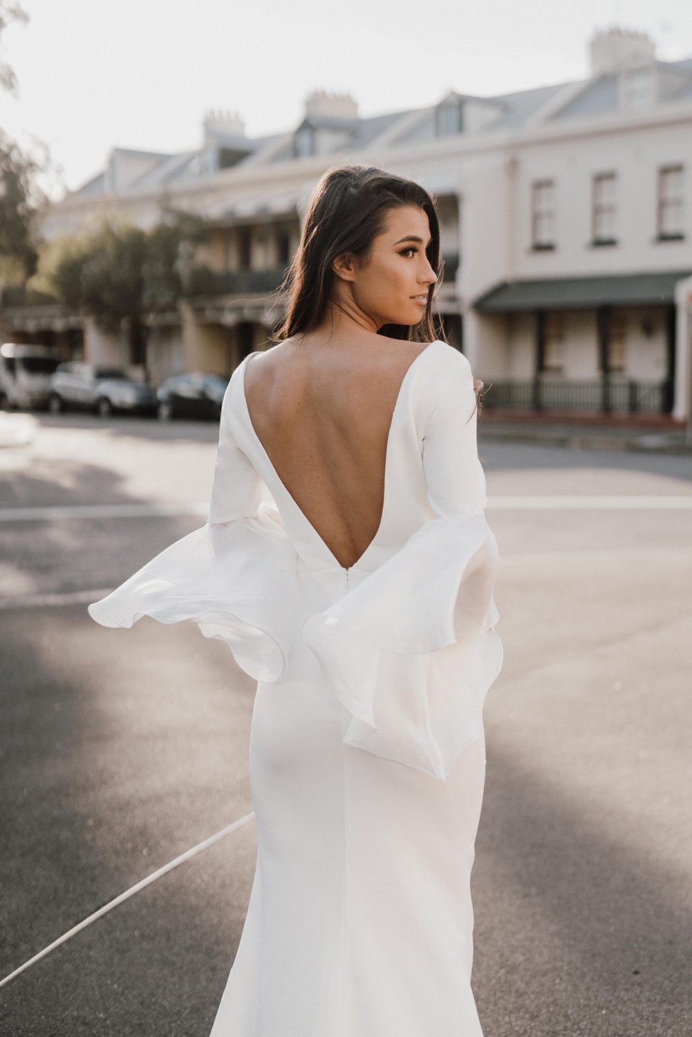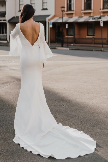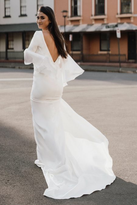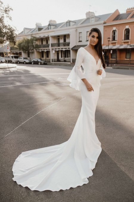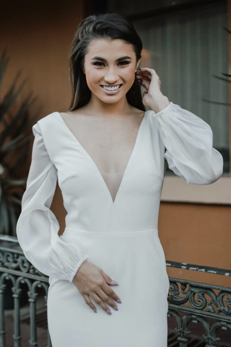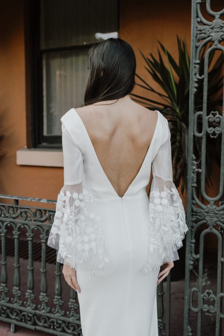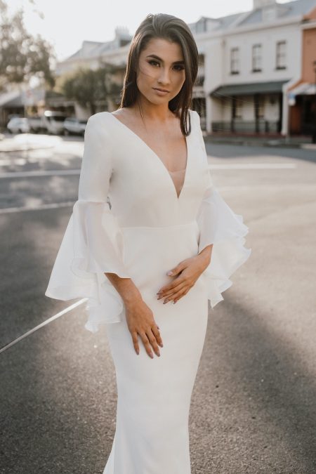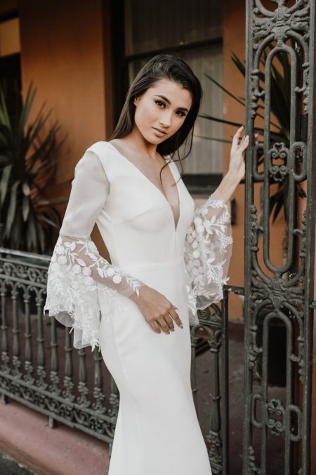 Our TORONTO gown is for the fashion-forward romantic bride. Its silhouette is minimalistic with fitted french ivory matte crepe. The eye-catching additions to this gown are the multiple sleeve options. Choose from lace floral sleeves, organza sleeves, or a mixture of both. Also available with full crepe sleeves.